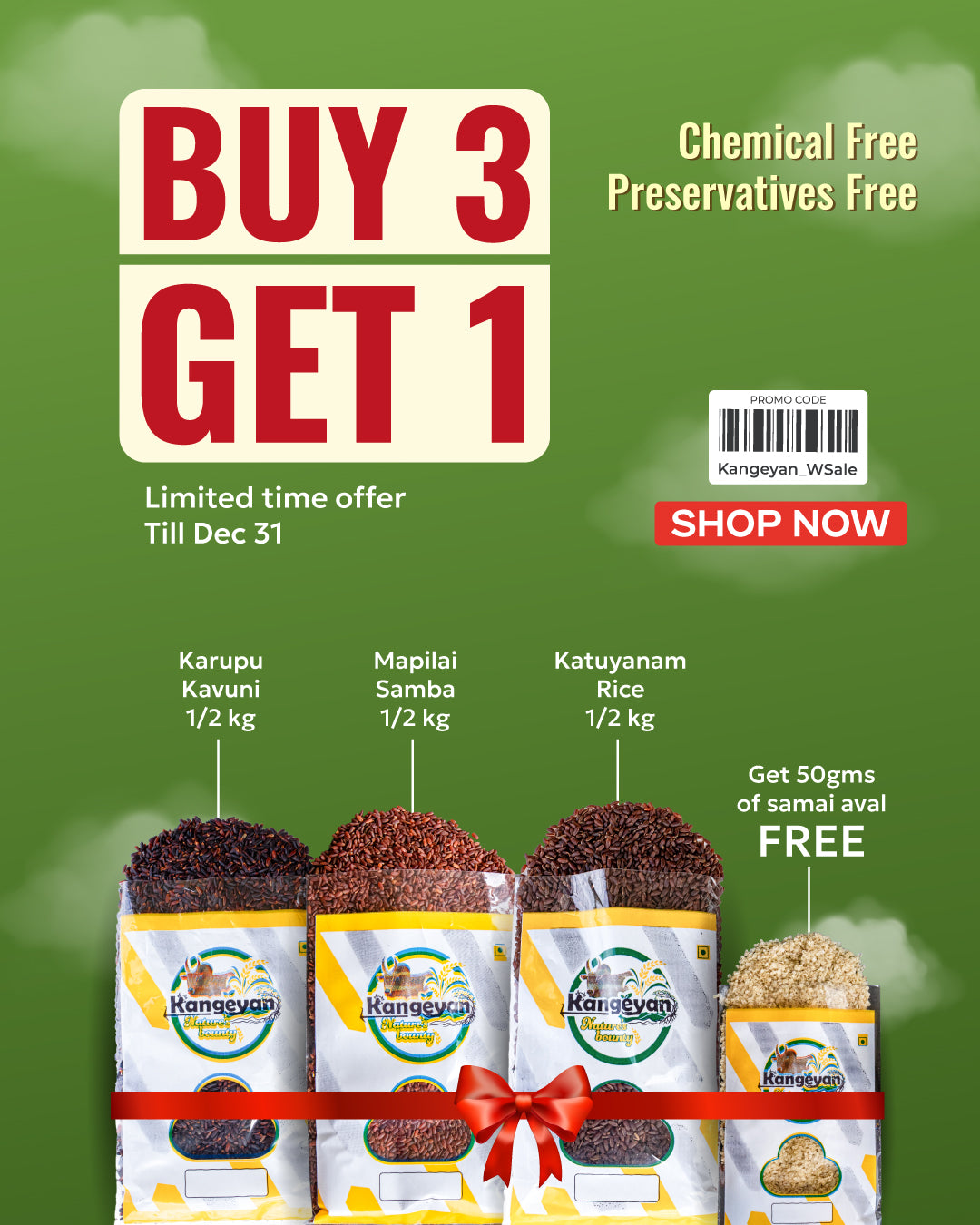 Katuyanam, Karupu Kavuni, and Mappillai Samba are ancient Tamil rice varieties treasured for their exceptional health benefits. These nutrient-dense whole grains are rich in antioxidants, iron, zinc, and B vitamins that boost energy, strengthen immunity, and support heart health. High in fiber and low on the glycemic index, they aid digestion, help manage blood sugar levels, and promote natural weight management. Unlike polished white rice, these traditional varieties retain their natural nutrients, offering sustained energy and superior nutrition while preserving centuries-old agricultural heritage.