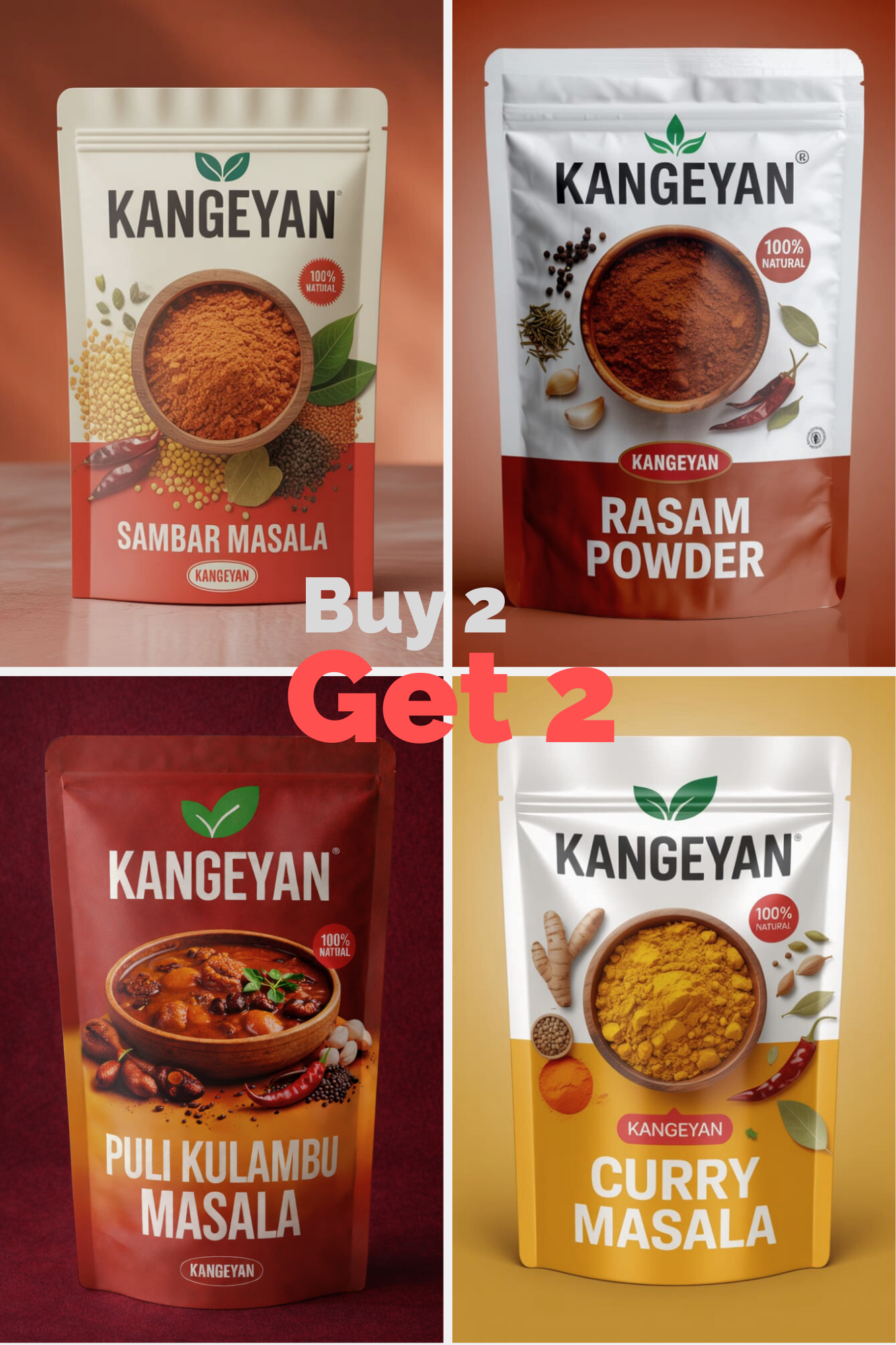 Kangeyan Masalas are lovingly crafted by our family elders. We carefully roast and grind each spice to perfection, just as we would for our own home cooking. Every batch is tested in our kitchen, ensuring it meets the highest standards before it's shipped to you. 50 grams each A pinch of our masala is all it takes to bring rich, authentic flavor to your dishes. We guarantee it will elevate your cooking and delight your taste buds. Stay Healthy, Eat Healthy.